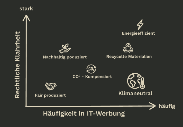 Diese Grafik zeigt, wie oft grüne Begriffe in IT-Werbung vorkomme, und wie stark sie gesetzlich geregelt sind. Hover über die Punkte, um mehr über jeden Begriff zu erfahren.